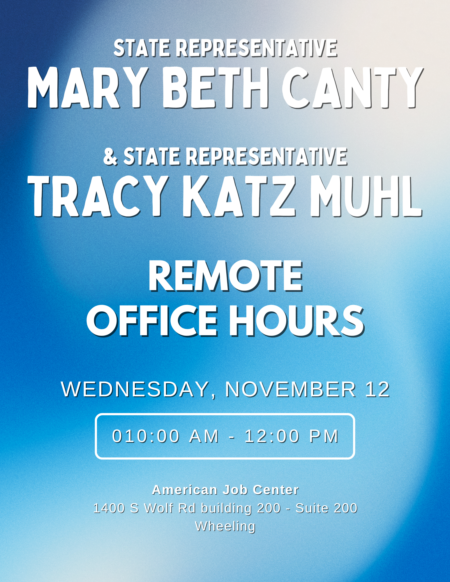 Staff from State Rep Tracy Katz Muhl,and State Representative Mary Beth Canty. Our teams will be hosting remote office hours at American Job Center in Wheeling (1400 S. Wolf Ste. 200 Wheeling) from 10am – 12 noon. Please stop by with thoughts and questions!